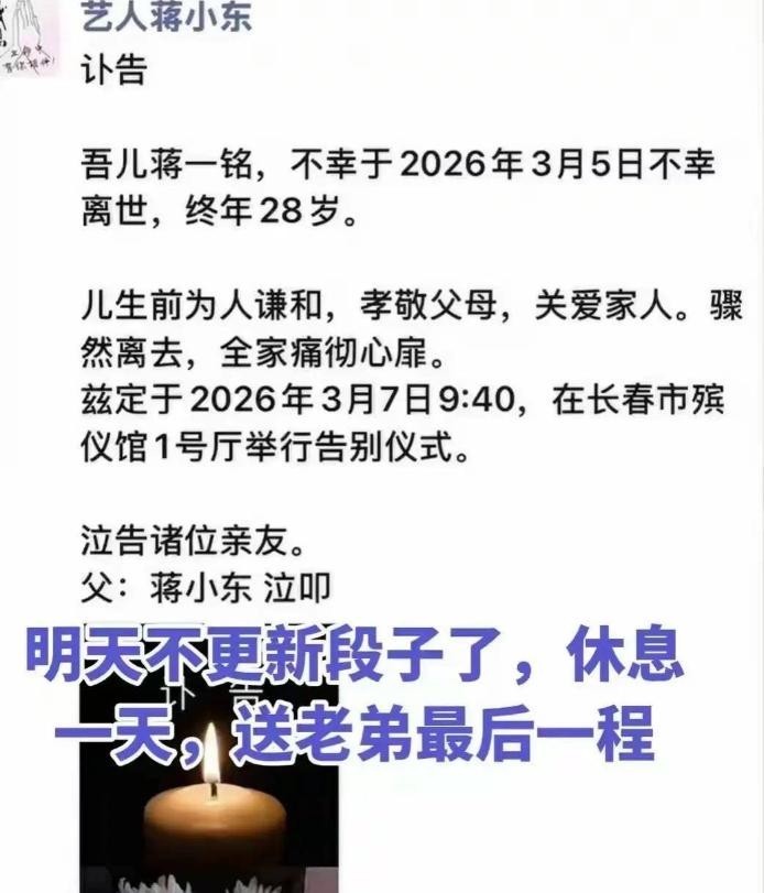 消息传开后,蒋小东亲手拟定的讣告仅寥寥数语,白纸黑字间没有修饰,亦无情绪外溢,却字字如凿,在父亲心口刻下无法愈合的深痕。